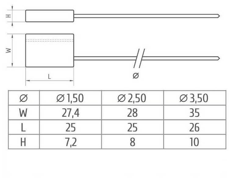 Пломба оснащена различной длиной троса. Цена указана для силовой тросовой пломбы с длиной троса 50 см., диаметр – 2,5 мм.